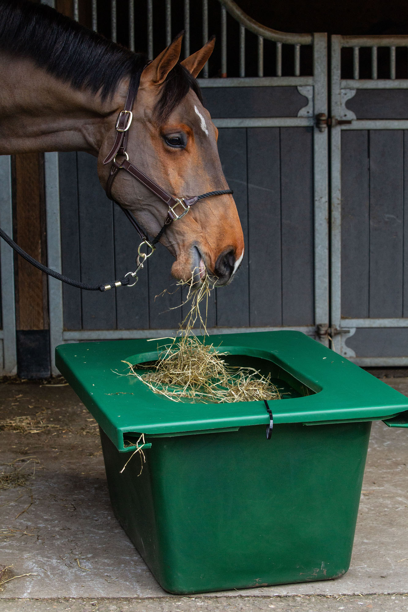Pour les chevaux se nourrissant au box ou en abri de prairie, les râteliers d’angle d’antan sont toujours appréciés pour leur praticité : rapidité de remplissage, gaspillage réduit et contamination croisée litière/fourrage limitée. Dans leur version moderne, ils sont généralement en plastique et d’une surface lisse et pleine, ce qui limite drastiquement les risques de blessure. « D’une capacité de 8kg de foin, le râtelier d'angle DuraBar Haygain se remplit facilement à la fourche, quand le Hayholder en contient jusqu’à 15kg. Nous avons aussi le populaire Slow Feeder Forager Haygain, un râtelier à foin plutôt destiné à un cheval au box et dont la grille de ralentissement d’ingestion réduit la possible frustration », achève Sandrine Lacomme. « Enfin, À Cheval distribue également un râtelier/filet à foin de mur qui contient 12kg de foin ou encore une balle à foin Hay Play (contenance de 3kg de foin), très appréciée des chevaux qui aiment secouer/malmener leur outils de distribution habituels ! ».