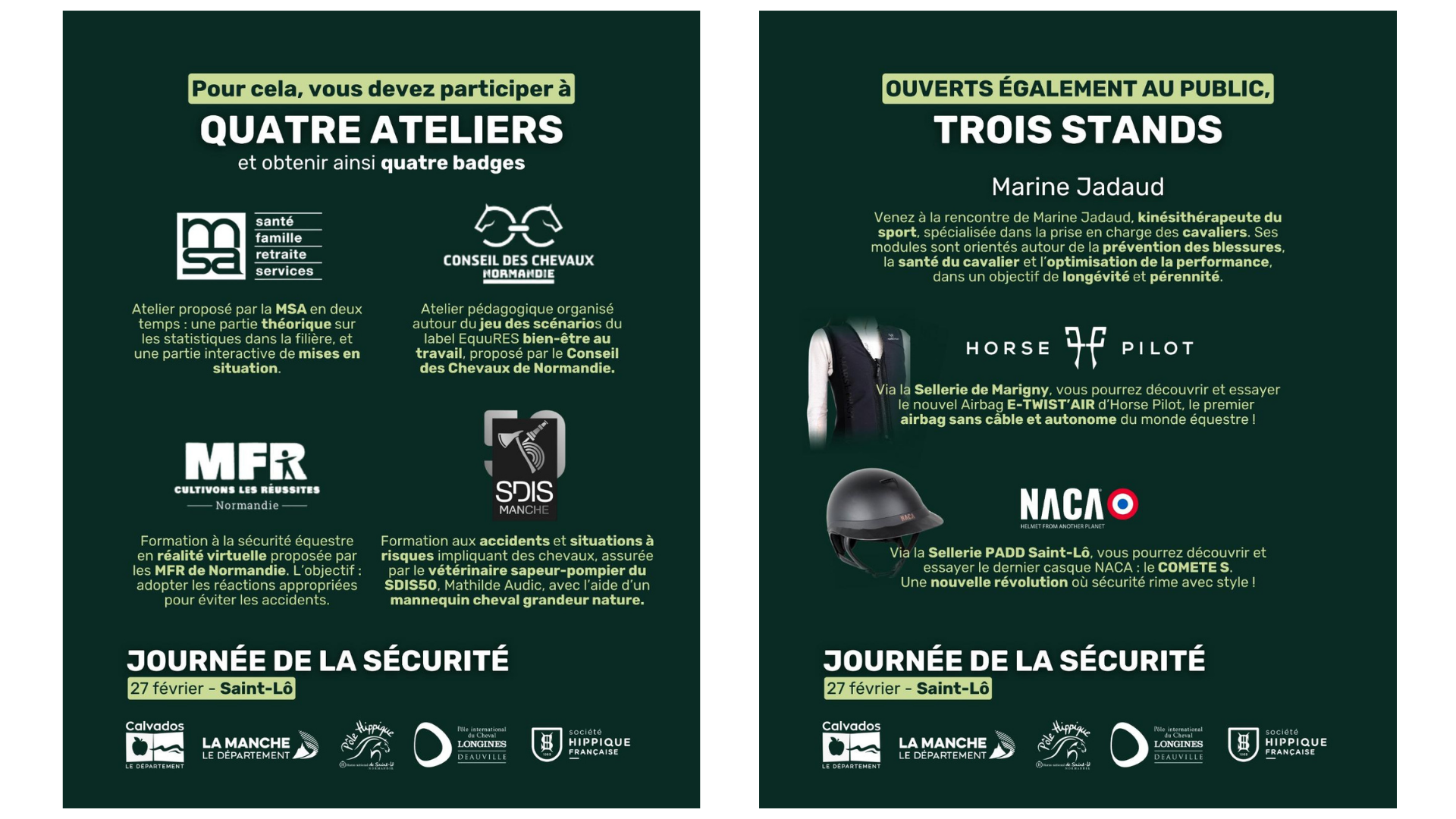 Seront également présents : Marine Jadaud (CavalFit), kinésithérapeute du sport ; la sellerie Marigny, avec l’Airbag E-Twist’Air Horse Pilot et la sellerie Padd Saint-Lô, avec le casque Comète S, de NACA.