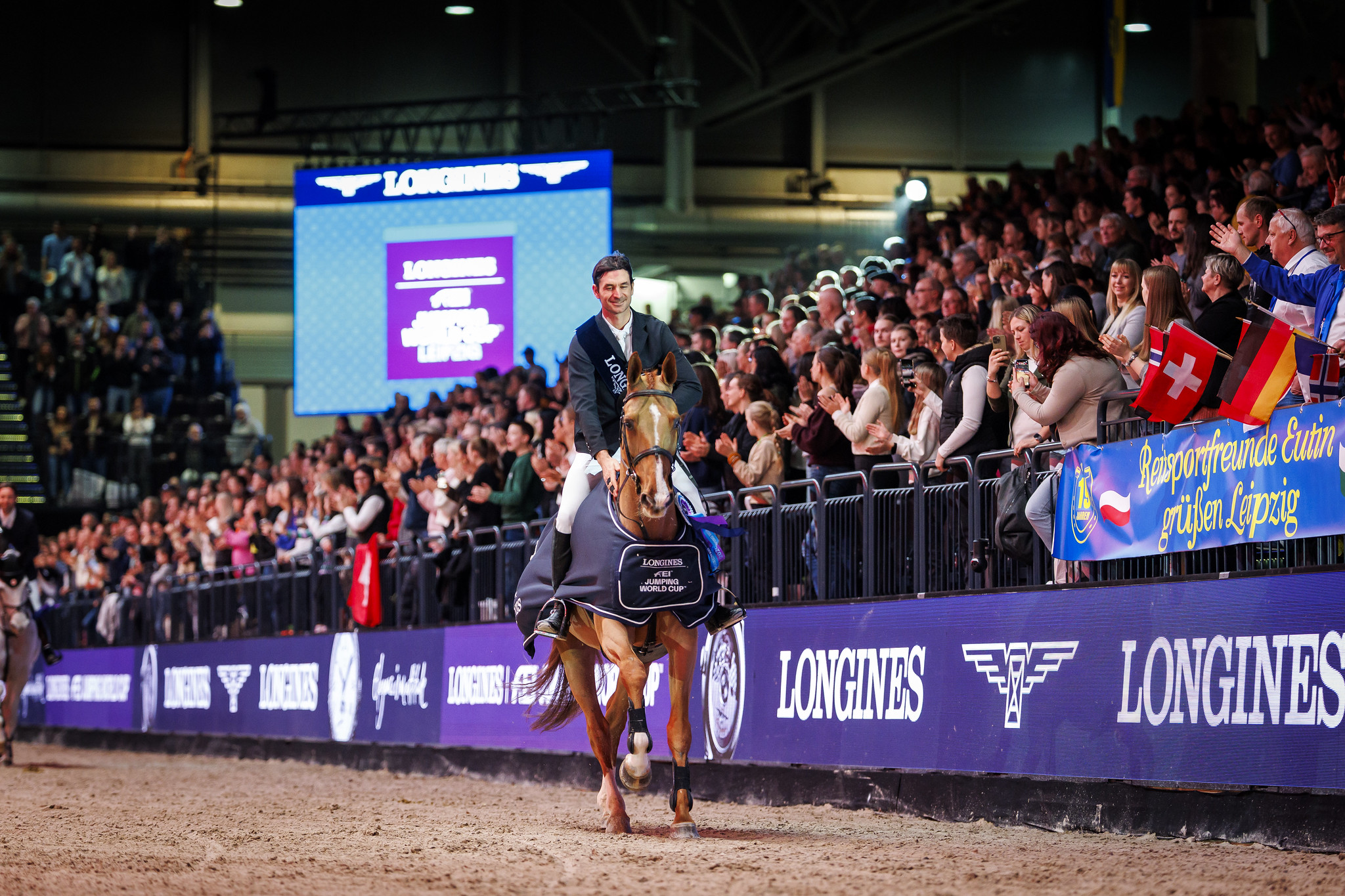 Steve Guerdat et Iashin Sitte ont mené le tour d'honneur du Grand Prix Coupe du monde de Leipzig. © Stefan Lafrentz / FEI