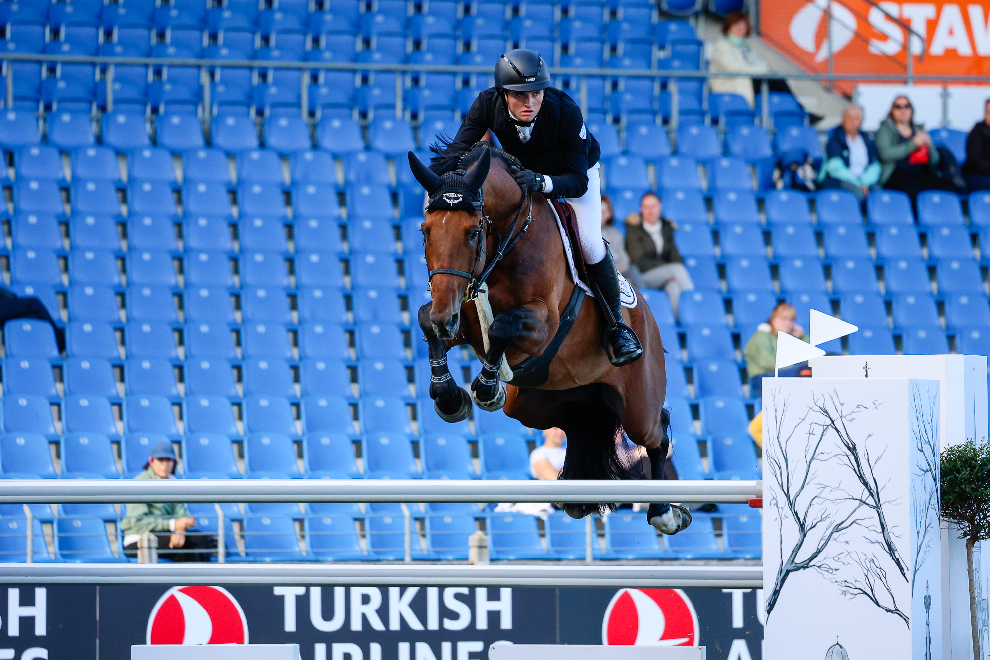Très remarqué lors de la finale française réservée aux chevaux de cinq ans, l’étalon Kloroking de Hus (Kannan x Coriano), a rejoint les écuries Ballypatrick de Greg Broderick. L’Irlandais a annoncé la nouvelle sur ses réseaux sociaux début octobre, quelques jours après que le propre frère du très prometteur Party In de Hus, monté par Willem Greve, a pris le départ des Mondiaux de Lanaken. Avec Leah Stack, l’alezan a concédé une faute lors de la première qualificative. Ne manquant ni de moyens ni de style, Kloroking de Hus est issu de la Stamm 703 du Holstein, celle d’un certain Carinjo*HDC. Jusqu’à sa vente, conclue à Fontainebleau, le Selle Français était monté par Amélie Lebrisollier Spilmann. Ensemble, ils avaient signé deux sans-faute lors des deux qualificatives bellifontaine et renoncé à prendre part à la dernière journée de compétition.