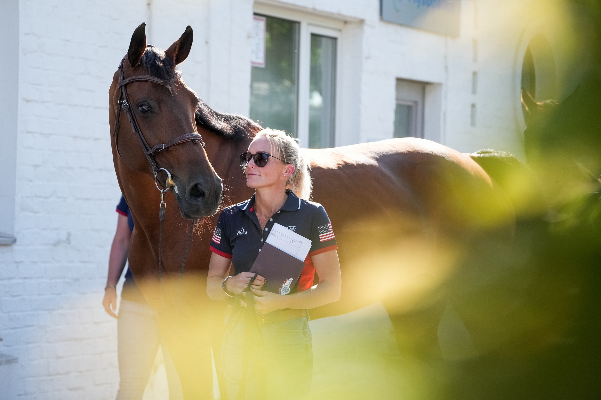 Après une première expérience professionnelle sur ses terres natales, Denise, qui a toujours su qu’elle voulait être groom, traverse l’Atlantique. Sur le continent américain, elle œuvre d’abord pour le compte de Marilyn Little, cavalière états-unienne ayant longtemps combiné la pratique du concours complet et du saut d’obstacles à haut niveau et classée lors de ses quatre derniers Grands Prix 5* cette saison avec La Contessa 12 ! “J’aimais simplement les chevaux et être à l’extérieur. Je préfère un métier physique ; je trouve cela beaucoup plus simple à appréhender que de rester assise toute la journée dans un bureau”, sourit-elle. Dans les écuries Raylyn, Denise croise un certain Kent Farrington, qui monte des chevaux pour ses employeurs de l’époque. De fil en aiguille, l’Américain propose à la jeune femme de rejoindre son équipe. Ce qu’elle accepte, en 2012. Depuis, la soigneuse est restée loyale à son cavalier, dont elle est devenue le bras droit à mesure que les années ont défilé. “J’ai toujours aimé travailler sur le long terme, peu importe les écuries où je me trouvais. En rejoignant Kent, je ne pensais toutefois pas que notre collaboration durerait aussi longtemps ! C’est une belle aventure”, savoure Denise, autodidacte dans ce métier. “J’ai appris sur le tas, des personnes pour lesquelles j’ai travaillé, de mes erreurs et en observant mes pairs en concours”, ajoute-t-elle.