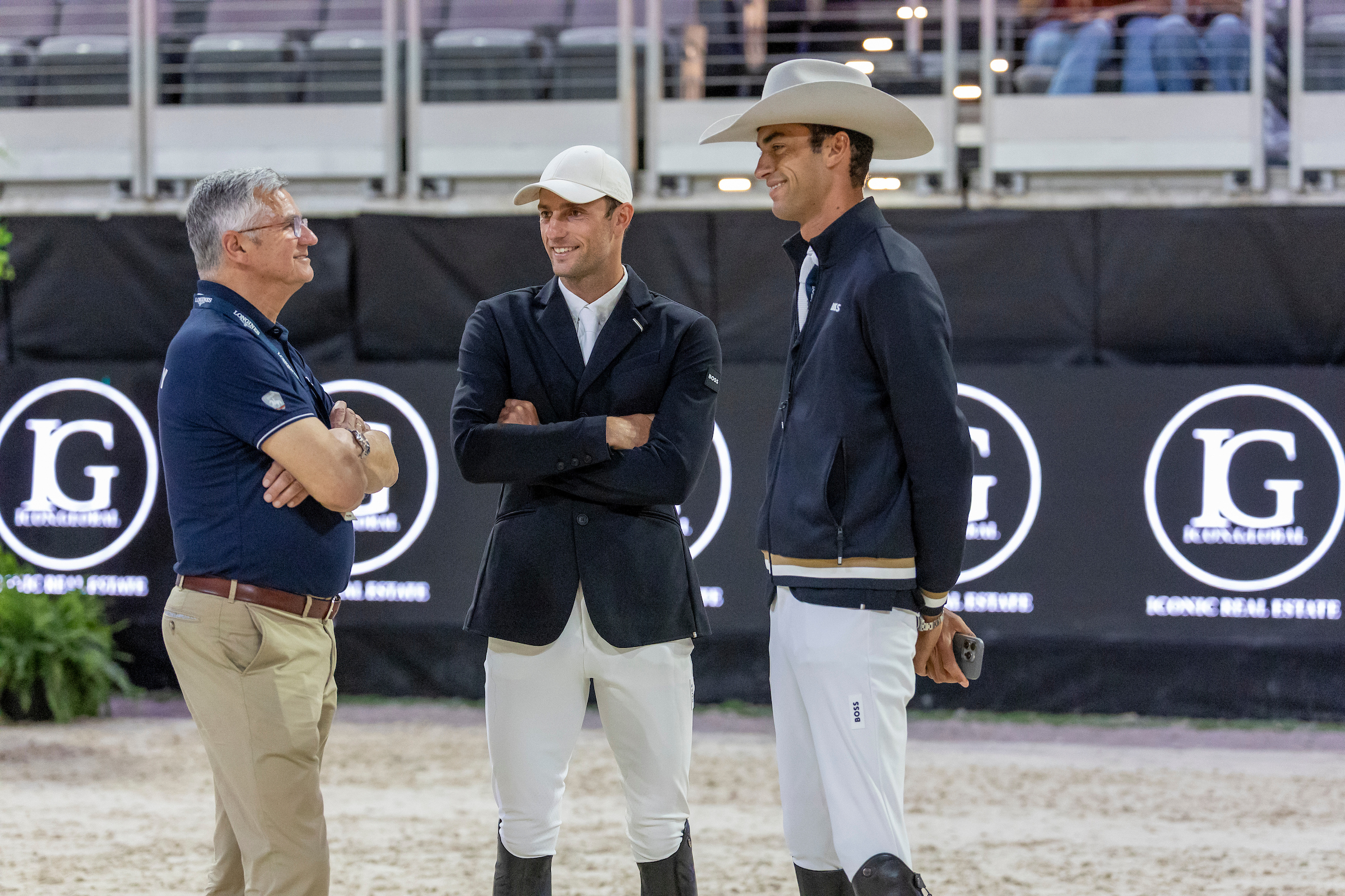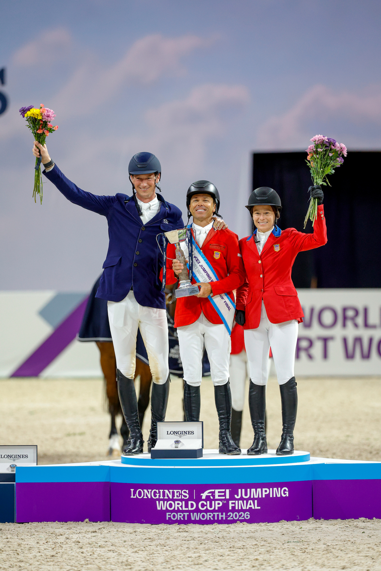 Au bout du suspense, le podium de la finale Longines de la Coupe du monde de saut d’obstacles de Fort Worth a récompensé Kent Farrington, Daniel Deusser et Katherine A. Dinan. © Tiffany Van Halle / Hippo Foto