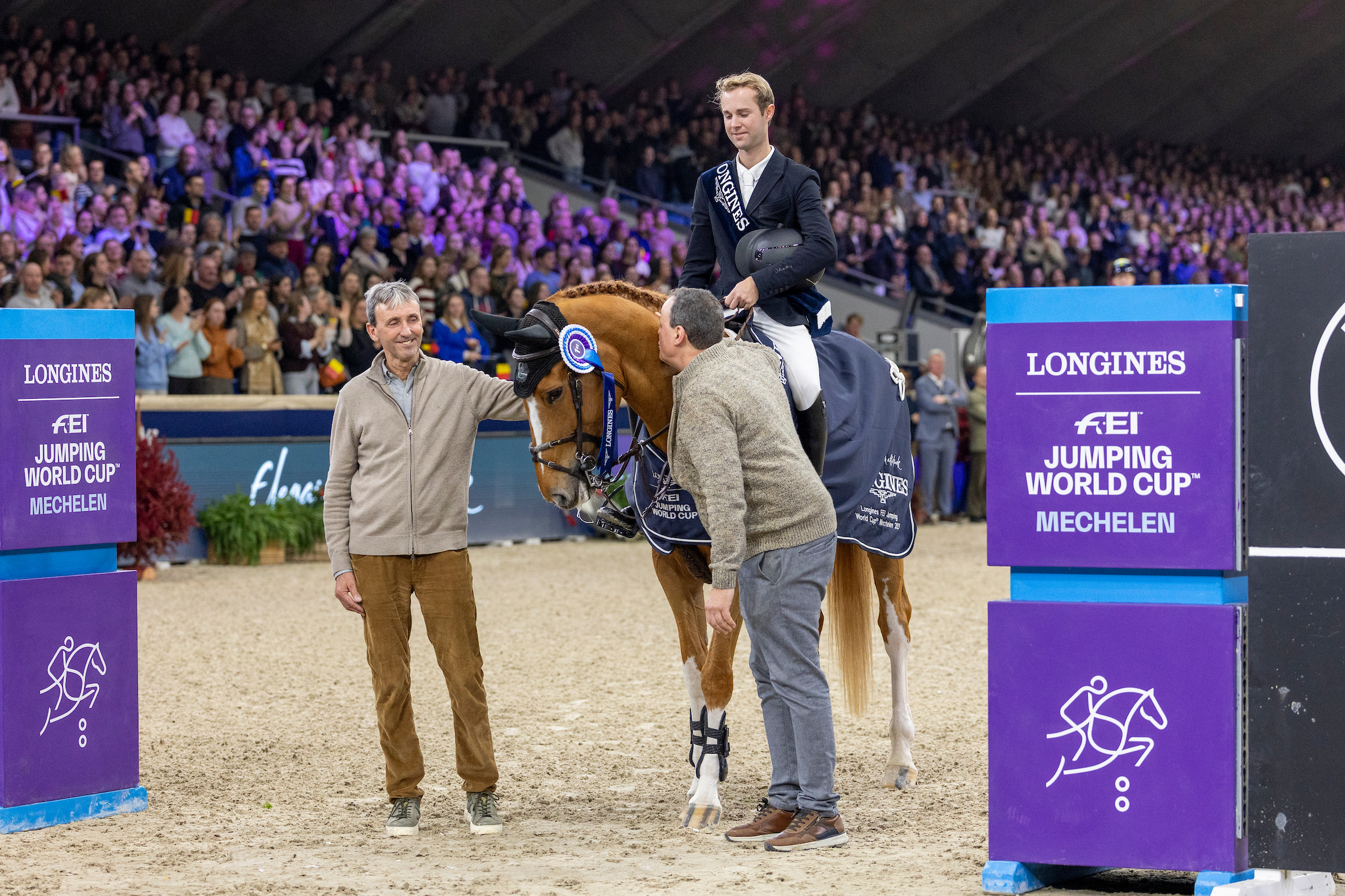 Mark Van Dijck, à gauche, et Wim De Nul, à droite, encadrent la championne Qalista DN, lauréate du Grand Prix Coupe du monde de Malines fin décembre. © Dirk Caremans / Hippo Foto