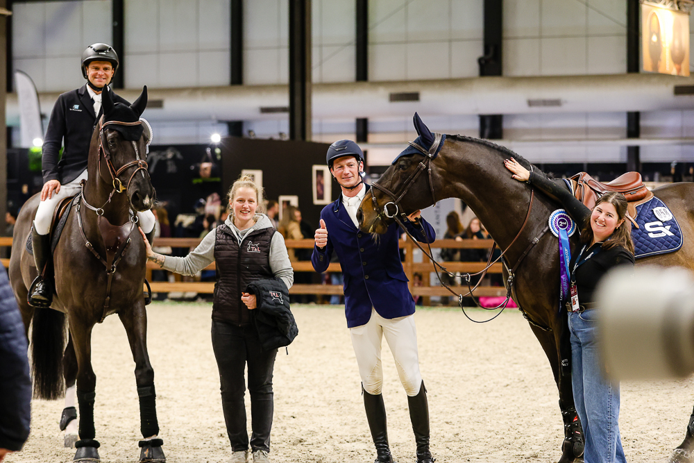 Deuxième après avoir concédé une faute au barrage, Otello de Guldenboom n’a pas reproduit ses exploits de La Baule et Vérone mais a partagé la remise des prix avec son demi-frère, Orak d’Hamwyck, un autre puissant fils de Tobago. Daniel Deusser et Frédéric Vernaet, leurs cavaliers, se sont prêtés à une petite photo souvenir ! © Mélina Massias